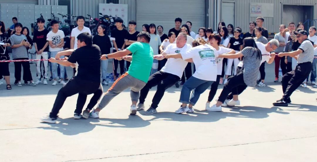 拔河比赛中大家铆足了劲把绳子往后拉,人心齐,泰山移,整个场面既激烈又温馨,大家团结不放弃的精神深深鼓舞和感染了在场的每一个人。